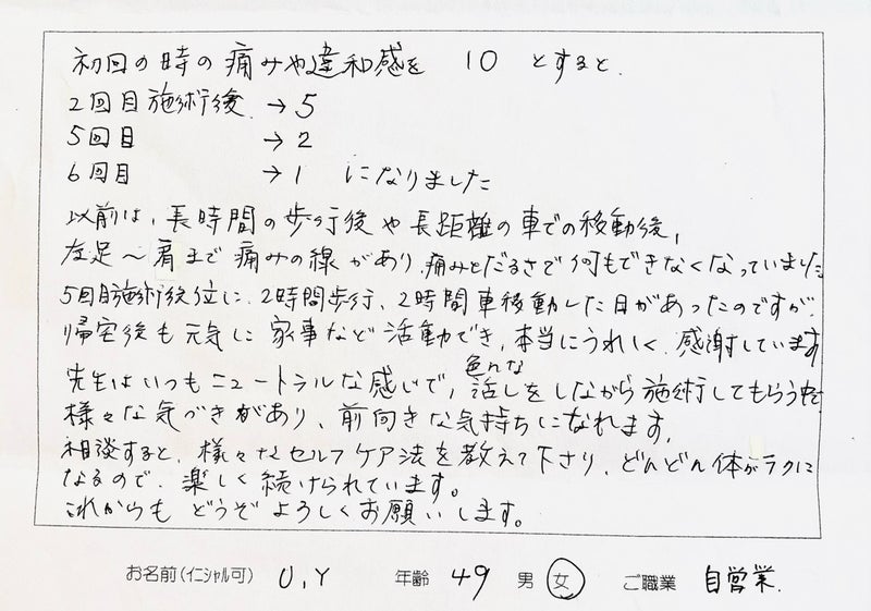 5日目施術後に2時間歩行、2時間車移動した日があったのですが、帰宅後も元気に家事など活動でき、本当にうれしく感謝しています。