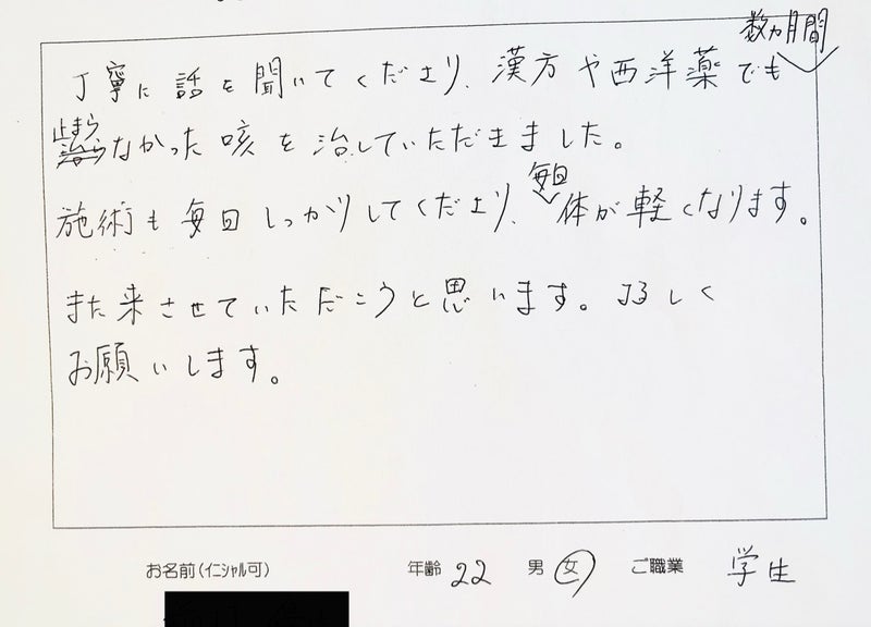 丁寧に話を聞いてくださり、漢方や西洋薬でも数カ月間止まらなかった咳を治していただきました。